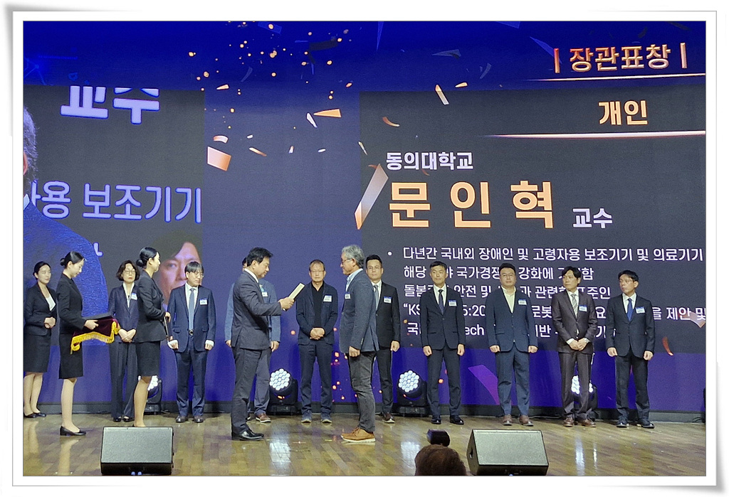 동의대 로봇공학과 문인혁 교수가 지난 10월 14일 서울 중구 대한상공회의소 국제회의실에서 열린 ‘2025 세계표준의 날 기념식’에서 의료로봇 및 재활복지분야 표준화에 기여한 공로로 산업통상부 장관 표창을 수상했다.
